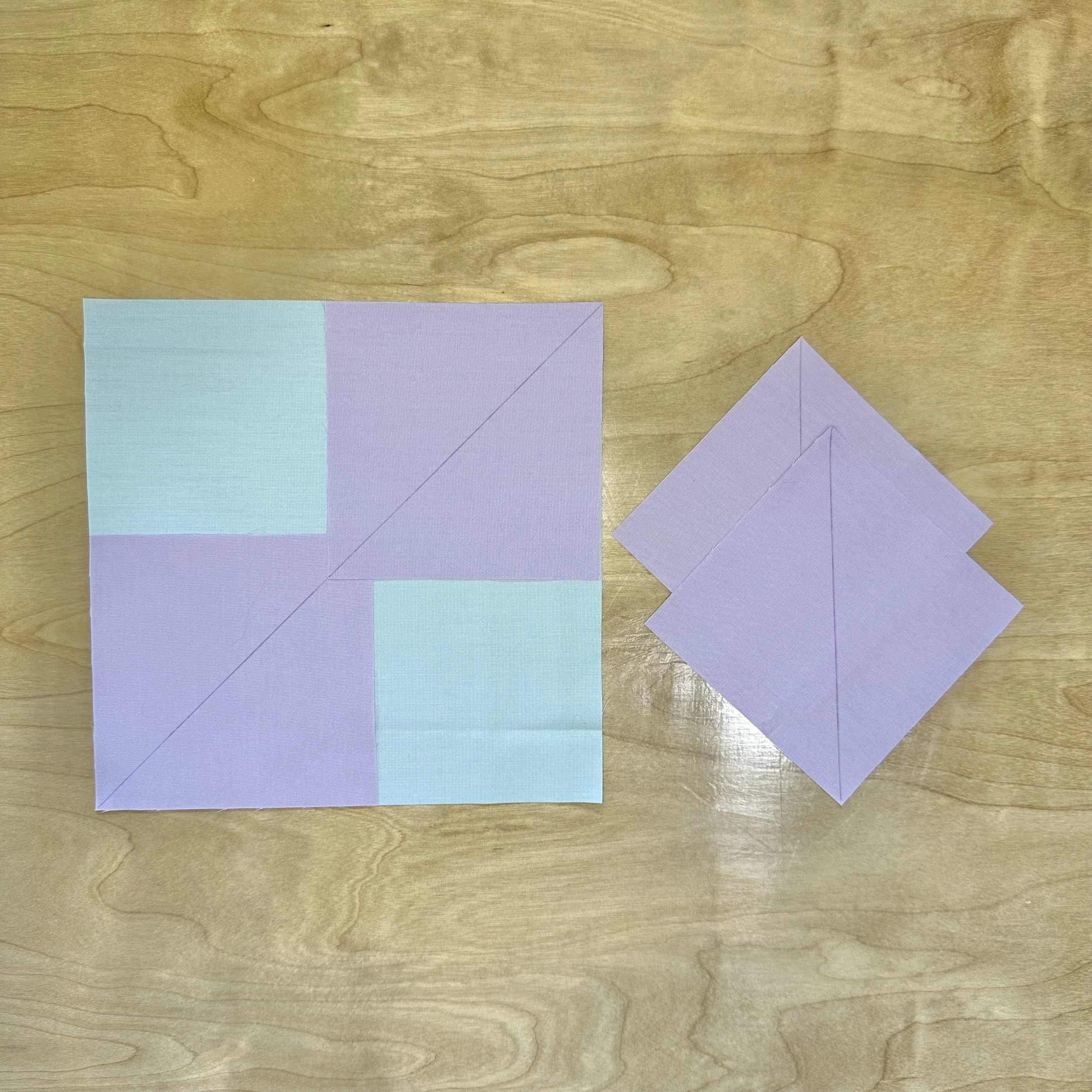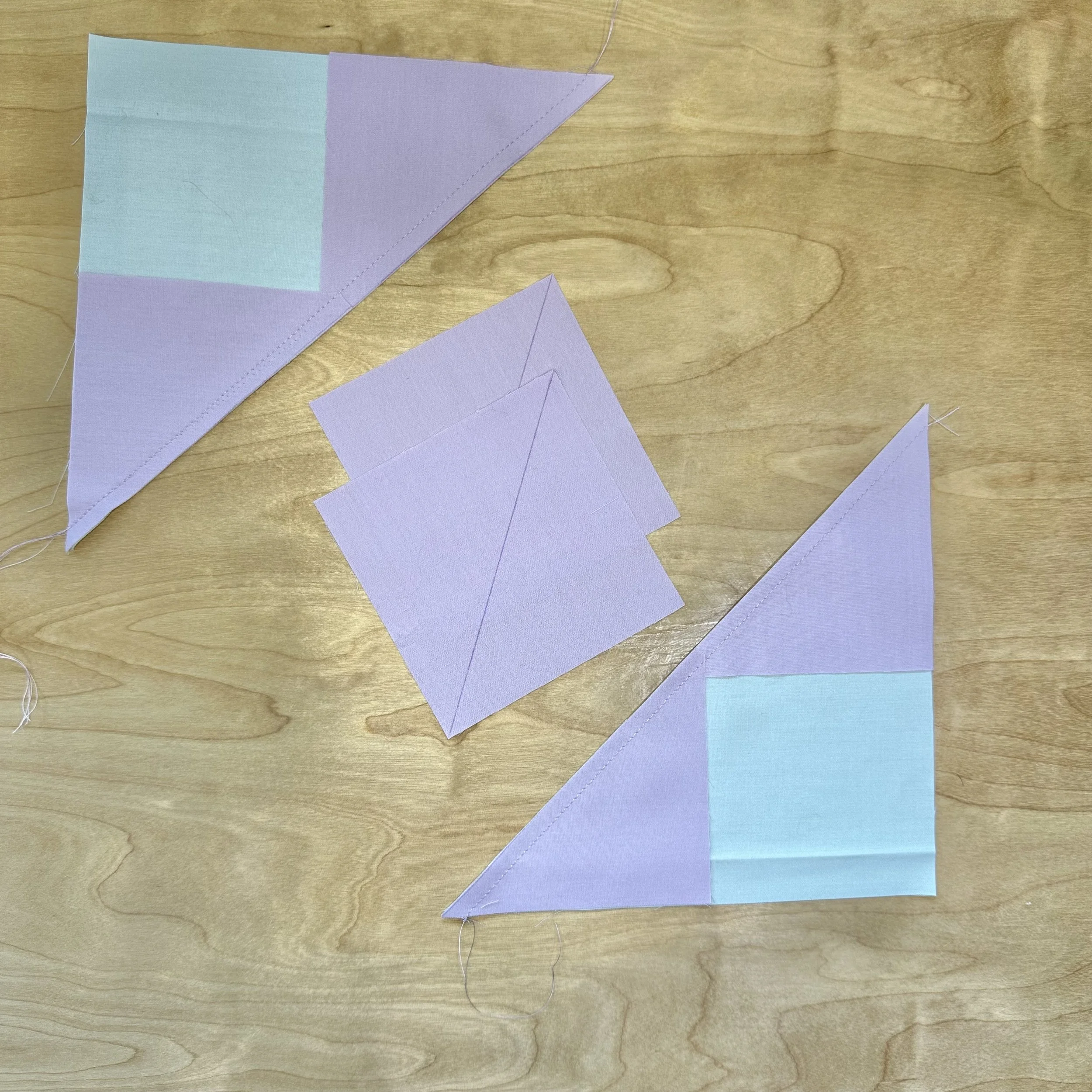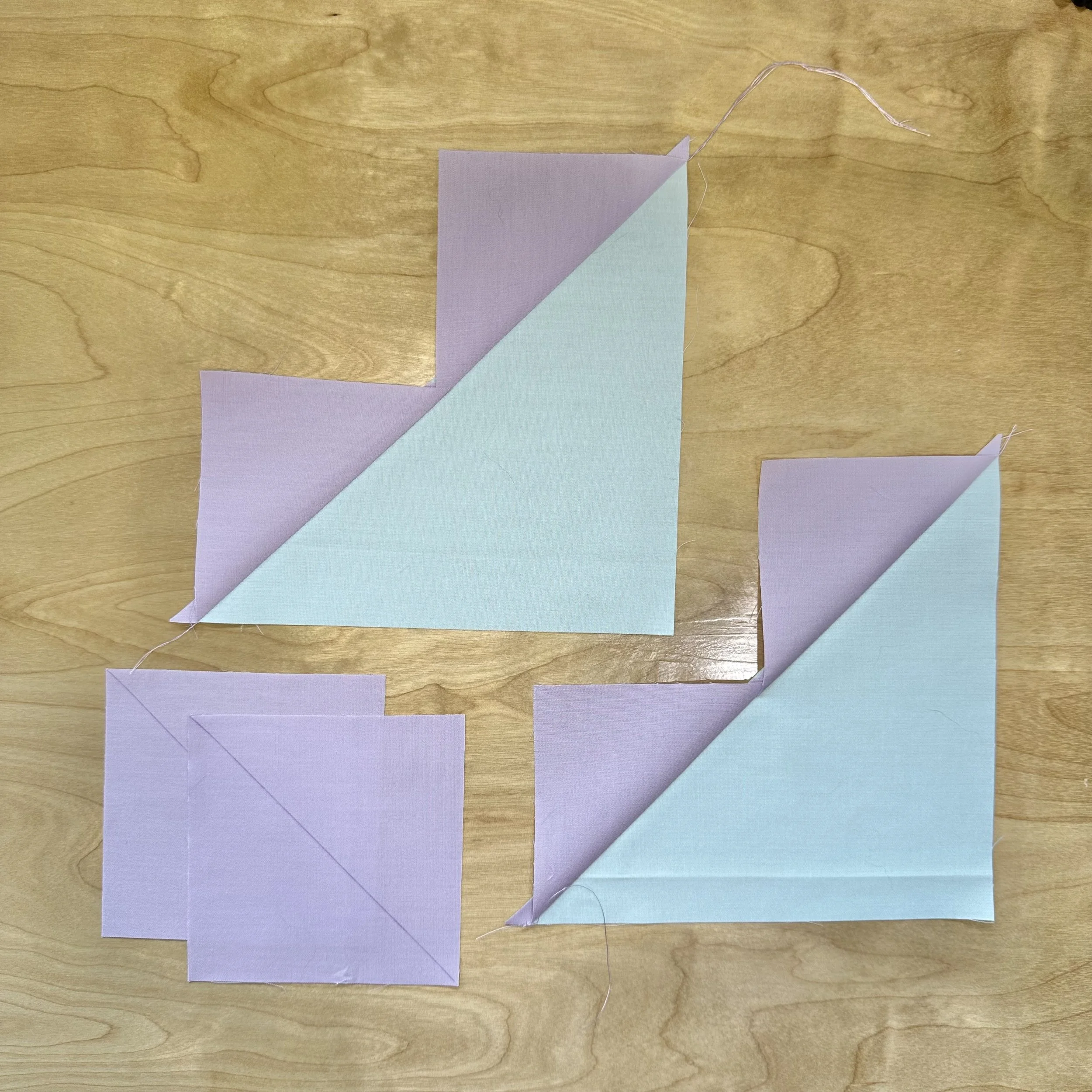 When you cut along the line, you will have two identical halves. If you have not trimmed off the corners of your small squares like in the previous step, as I have not done, I will sometimes trim a little off of the corners in this step to reduce future bulk within the seam allowance. I then press the two sky pieces (what are now triangles) away from the larger one, with the seam allowance pressed away from the main large triangle. You can also press the seams open, if you choose. If you have not sewn with a scant 1/4” or if your geese end up a little smaller than they should be, pressing the seams open should help.