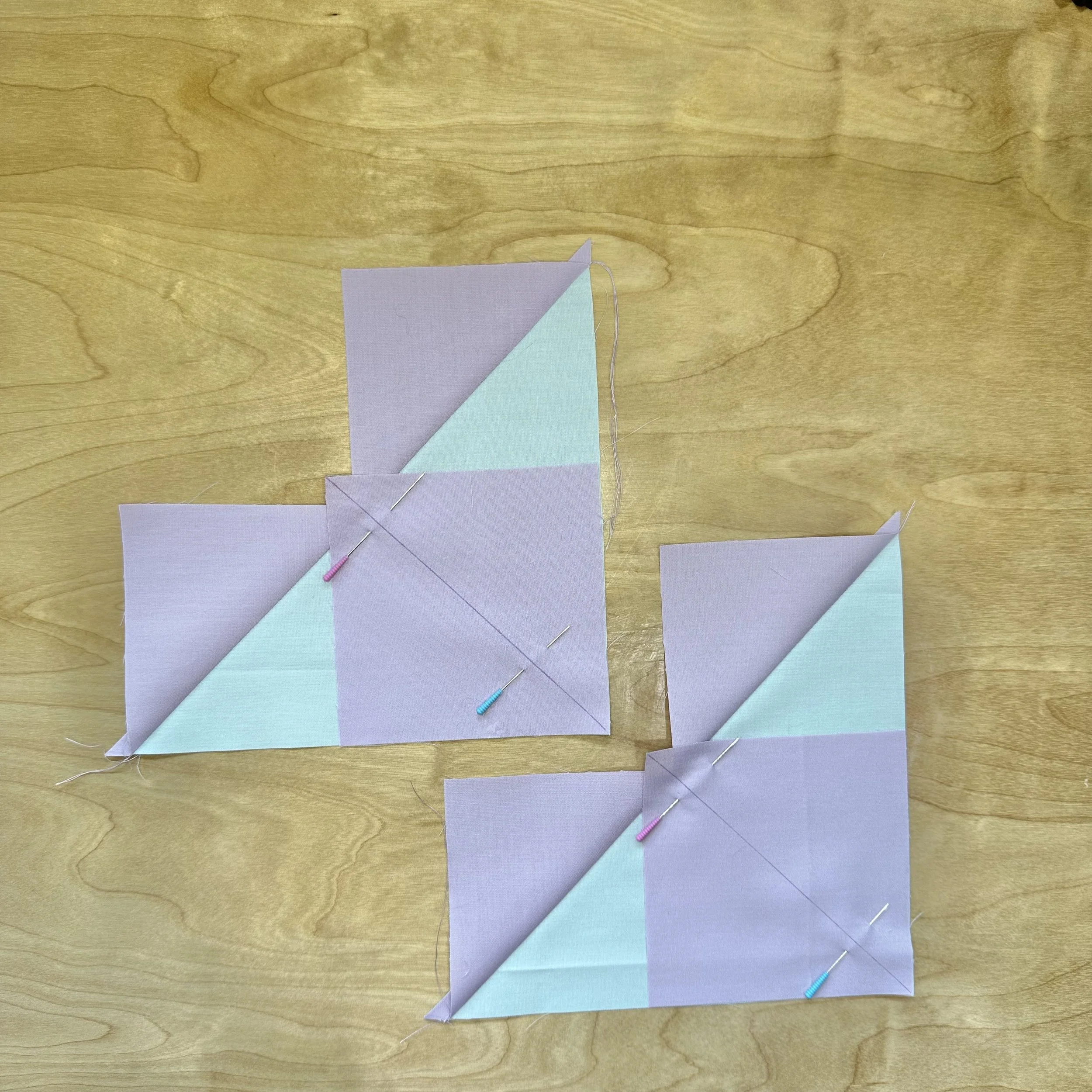 The smaller squares should be in the opposite corners of the larger square and the diagonal lines on the backs of the small squares should touch to create one diagonal line all the way across the larger block. The small squares overlap a bit. This can create bulk further down the lines. Some folks trim these corners of the small squares where they overlap, as indicated by the picture below. Pin these squares in place and sew just a hair or thread’s width less than a 1/4”, AKA a scant 1/4”. Not using a scant 1/4 can cause your sky pieces to fall short of where they need to reach once they are pressed in place.
