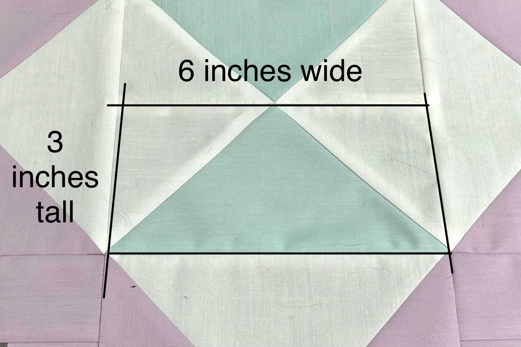 Flying Geese are virtually always in a 2:1 ratio when finished. Their width is twice their height. The Flying Geese in my Mazant pattern for example is pictured below, finished at 6” wide and 3” tall, but flying geese can be 2 x 1, 5 x 2.5, 8 x 4, etc., etc. And like with any quilt block, their unfinished size is a half-inch larger in each direction to include your quarter-inch seam allowance on all four sides; so the Mazant Flying Geese unfinished are 6.5 x 3.5”, and to continue with the other examples, those unfinished blocks would be 2.5 x 1.5, 5.5 x 3, and 8.5 x 4.5, respectively.
