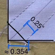 But why is the seam allowance 3/8ths inch? Shouldn’t it be 1/4 like always? Yes, but there’s the angle to account for. We’re going to get really mathy here. When we are sewing along the diagonal, we are using our 1/4” seam allowance. However, when we are figuring out the size of our goose square, we increasing our size from our unfinished size, not along the diagonal where our seam is running, but along the width. Take a look at the picture below. You can see that the seam allowance at an angle is 1/4” (or 0.25 if using decimals), but the amount of fabric we need for the seam allowance is closer 3/8th inch (or 0.375, as a decimal). For those who remember your high school geometry, what we have here in this Flying Geese seam allowance is a “right-triangle”. Remember those? And you can use the Pythagorean Theorem find out that the width we need to add is 0.354” on either side. Now, 0.354 is not 0.375 (3/8ths), but it’s certainly close enough for quilting purposes. The good news is that none of that math is required to understand, nor do you need to replicate it in order to make beautiful flying geese, but, as I said earlier, for some of us, knowing the “why” makes it easier to understand and remember the “how”.